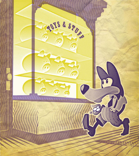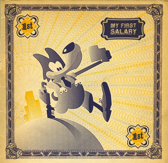 Geldwolfje. Serie illustraties over 'eerste' keren in je geldloopbaan; het eerste loon, de eerste hypotheek, de eerste erfenis, etc.